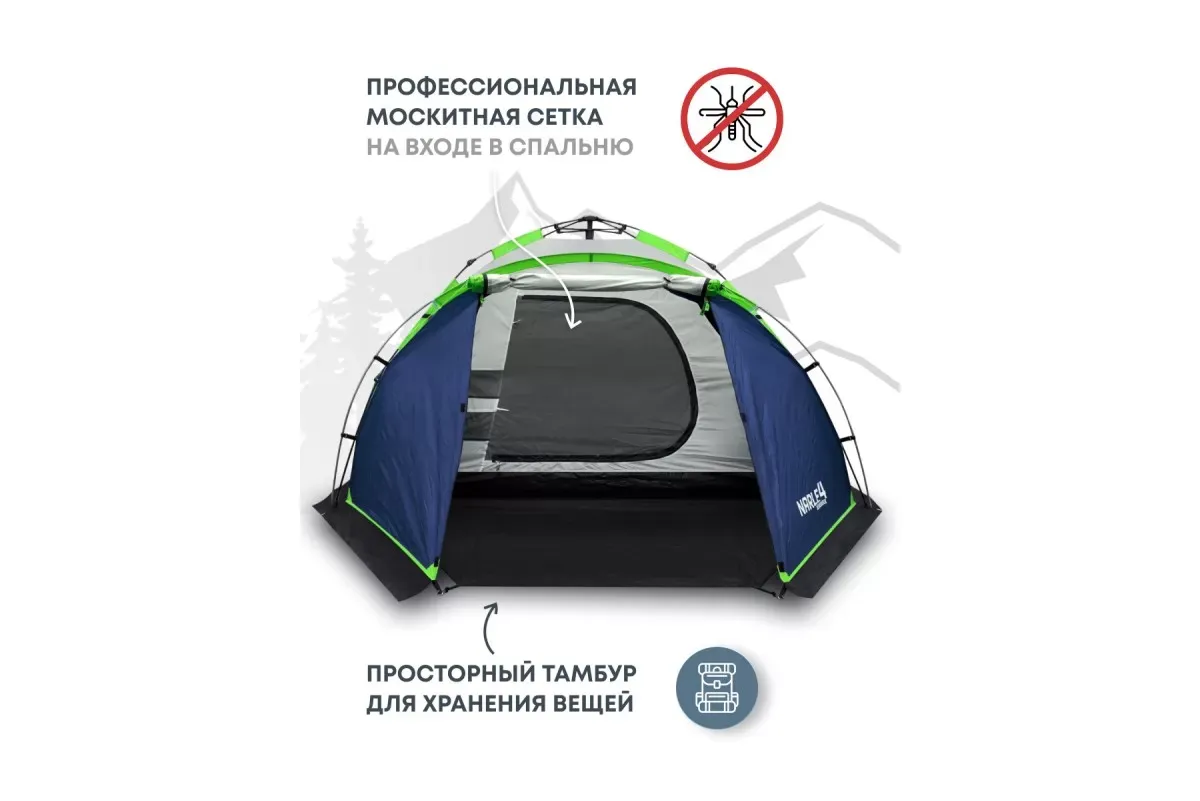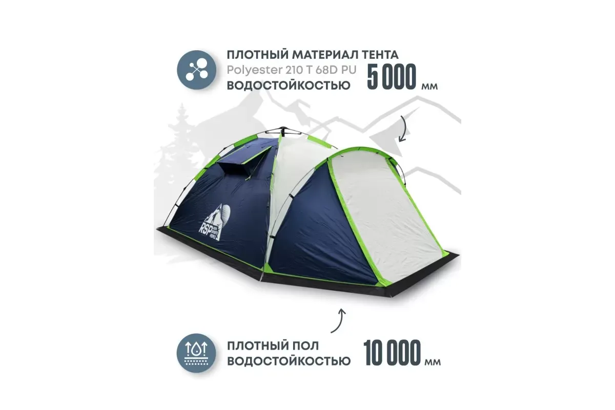Двухслойная конструкция улучшает вентиляцию, предотвращает образование конденсата и создает дополнительную защиту от насекомых. Тент выполнен из материала Polyester 210T 68D с водонепроницаемостью 5000 мм, все швы проклеены термоусадочной лентой. Тент имеет огнезадерживающую пропитку. Дно изготовлено из армированного полиэтилена (терпаулинга) с водонепроницаемостью 10000 мм.